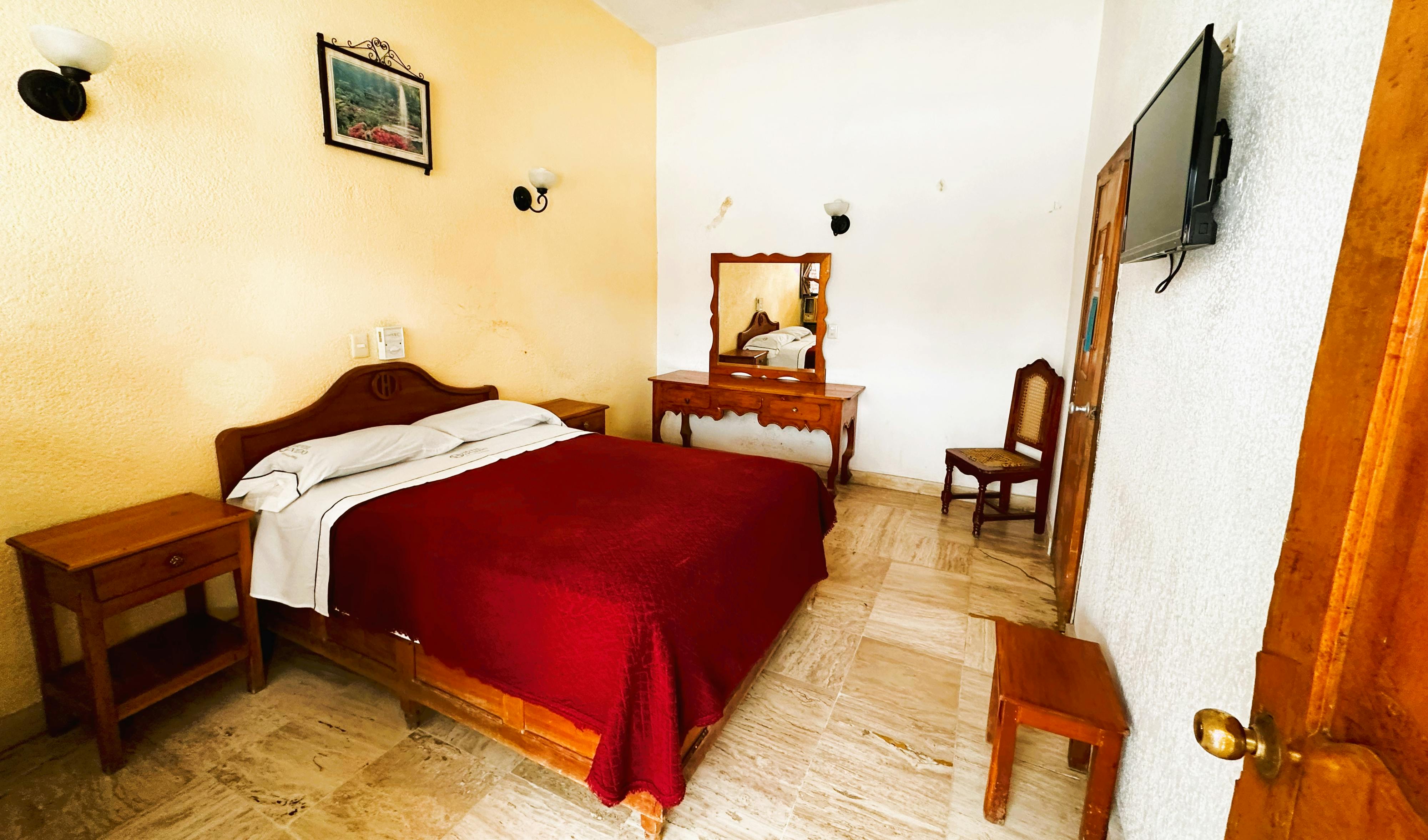 Habitación de 1 cama matrimoniales, hasta para 2 personas, baño integrado, televisión por cable, ventilador de techo y aire acondicionado.
