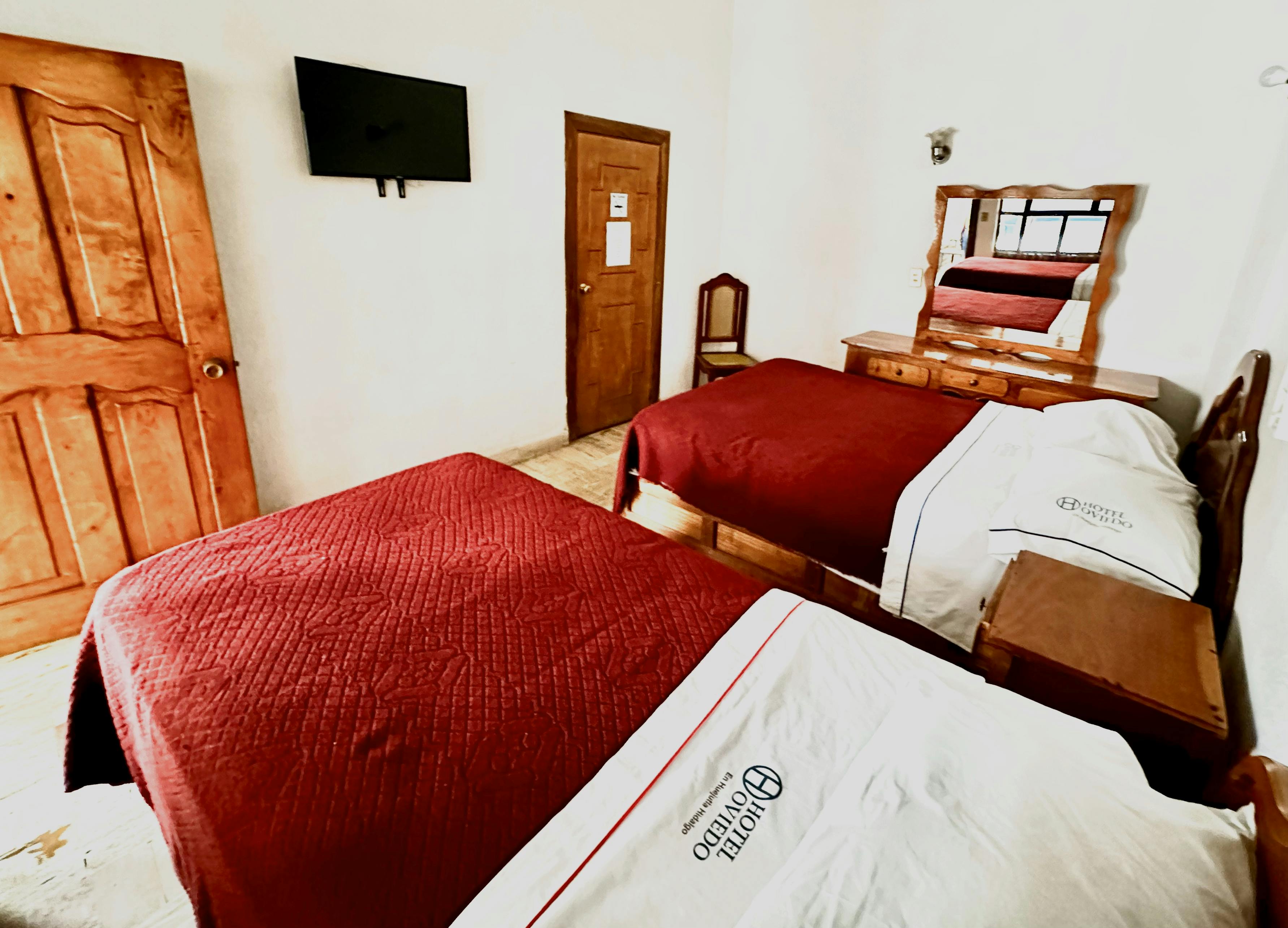 Habitación de 1 cama matrimonial más una individual, hasta para 3 personas, baño integrado, televisión por cable, ventilador de techo y aire acondicionado.